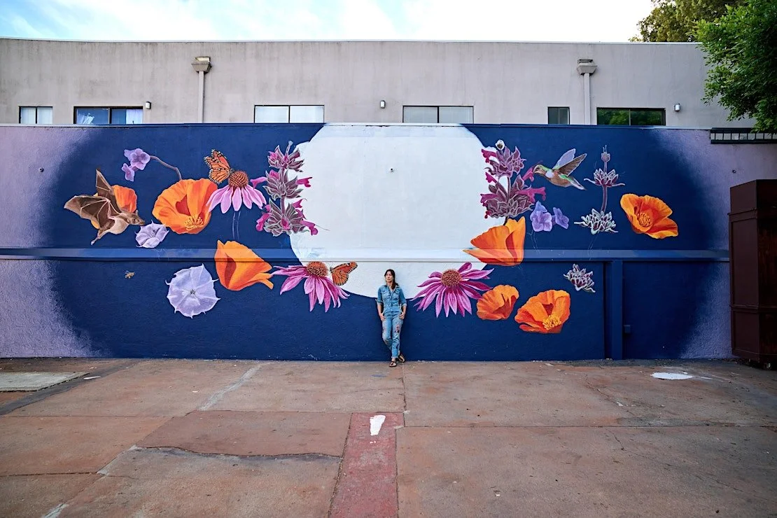 Centered on the tenacity of California native wildflowers and the precarious state of pollinator species, the mural is both a celebration of resilience and a call to action. Orielle envisions the work as an invitation for collective stewardship, affirming humanity’s capacity to protect and nurture the environment and each other.